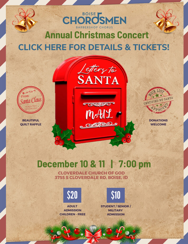 Get into the holiday spirit with an enchanting evening of music and cheer with the Boise Chordsmen at our annual Christmas Concert! Enjoy festive harmonies and a special appearance by Santa and Mrs. Claus, sharing heartwarming letters from children near and far. Don’t miss this magical night—reserve your tickets today and make memories that will last a lifetime!